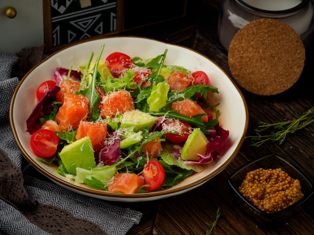 листья салатов айсберг, радичио, рукола, авокадо, помидоры черри, слабосоленый лосось, пармезан, сок лимона, оливковое масло, специи