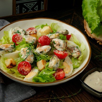 Салат "Цезарь" с мидиями в сливочном соусе