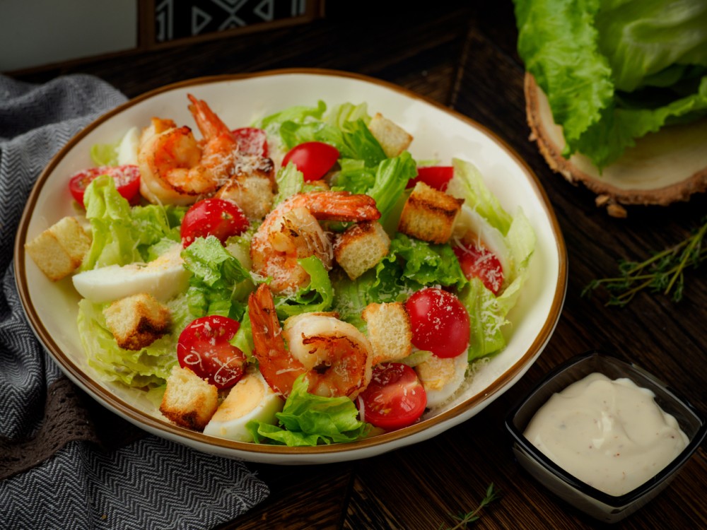 Тигровые креветки, листья салата айсберг, помидоры черри, яйцо, пармезан, крутоны, соус цезарь
