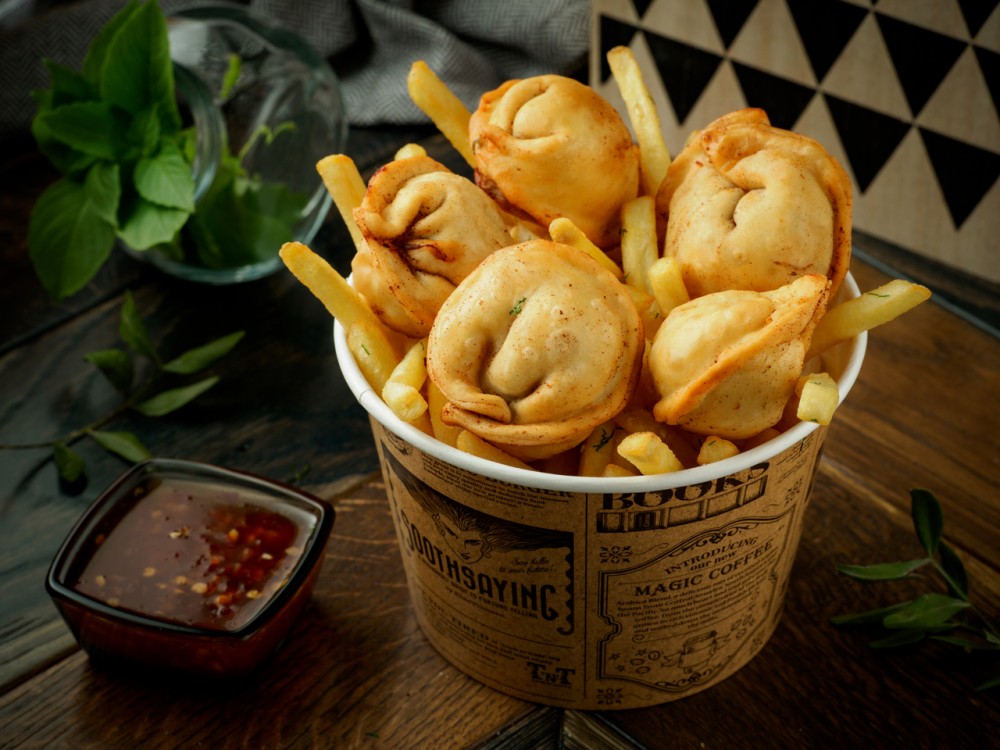 5 пельменей фри с курицей, картошка фри L с укропом, чесноком и жареным кунжутом, соус сладкий чили