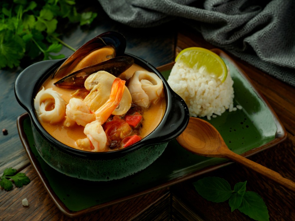 традиционный тайский кисло-острый суп на кокосовом молоке с тигровыми креветками, подаётся с рисом и лаймом