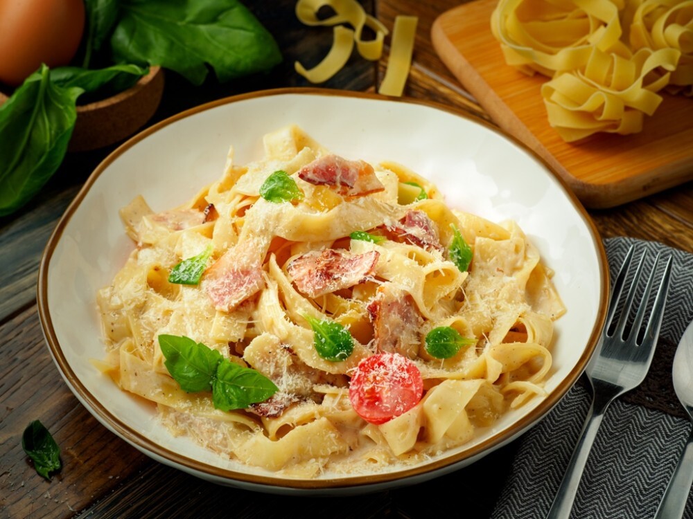 Паста в сливочном соусе с тигровыми креветками и пармезаном