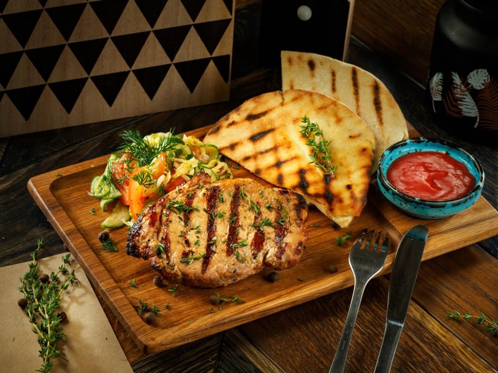 Свинина корейка в винном маринаде, овощной салат (к/к и б/к капуста, болг. перец, лук), соус BBQ, лаваш 110/50/30/100 гр
