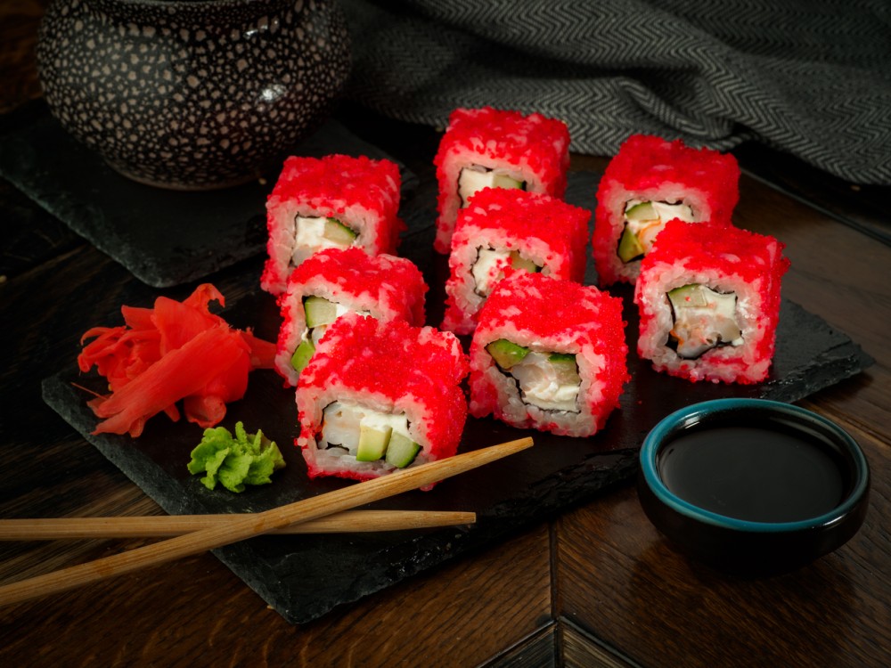 Сыр сливочный, авокадо, креветка, икра масаго малиновая. Соевый соус, имбирь, васаби 240/30/10/3 гр.