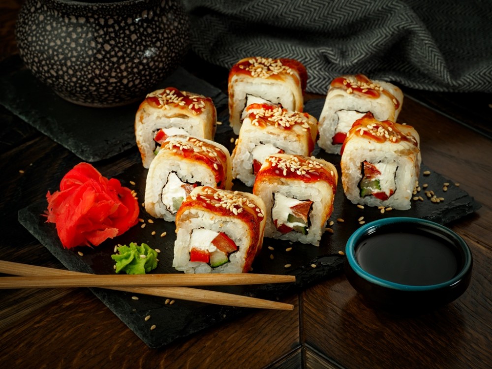 Сыр сливочный, помидоры, авокадо, угорь, соус унаги, кунжут. Соевый соус, имбирь, васаби. 265/30/10/3 гр.