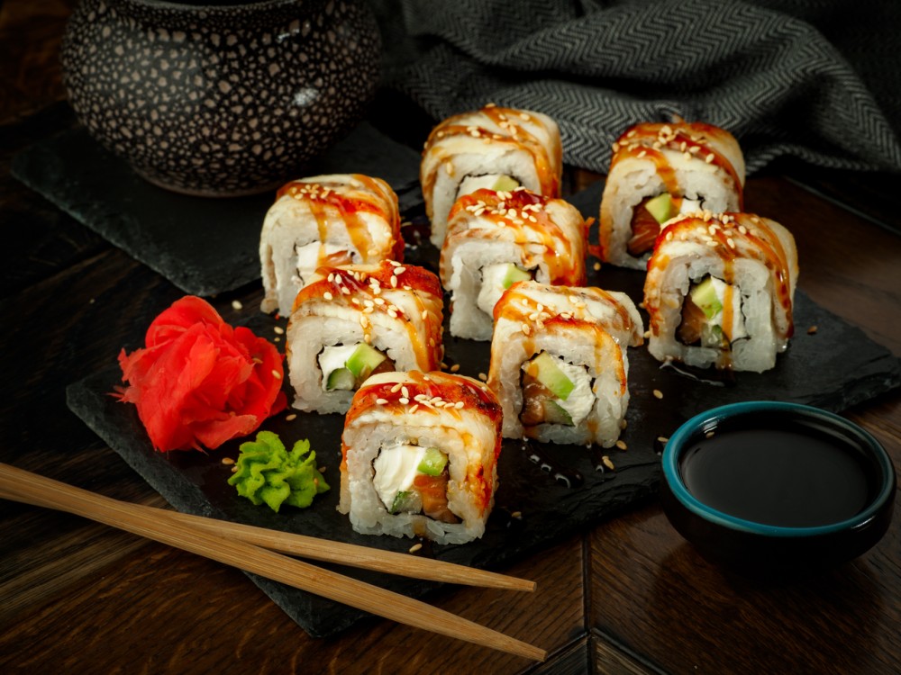 Сыр сливочный, авокадо, лосось слабосолёный, угорь, соус унаги, кунжут. Соевый соус, имбирь, васаби. 265/30/10/3 гр.