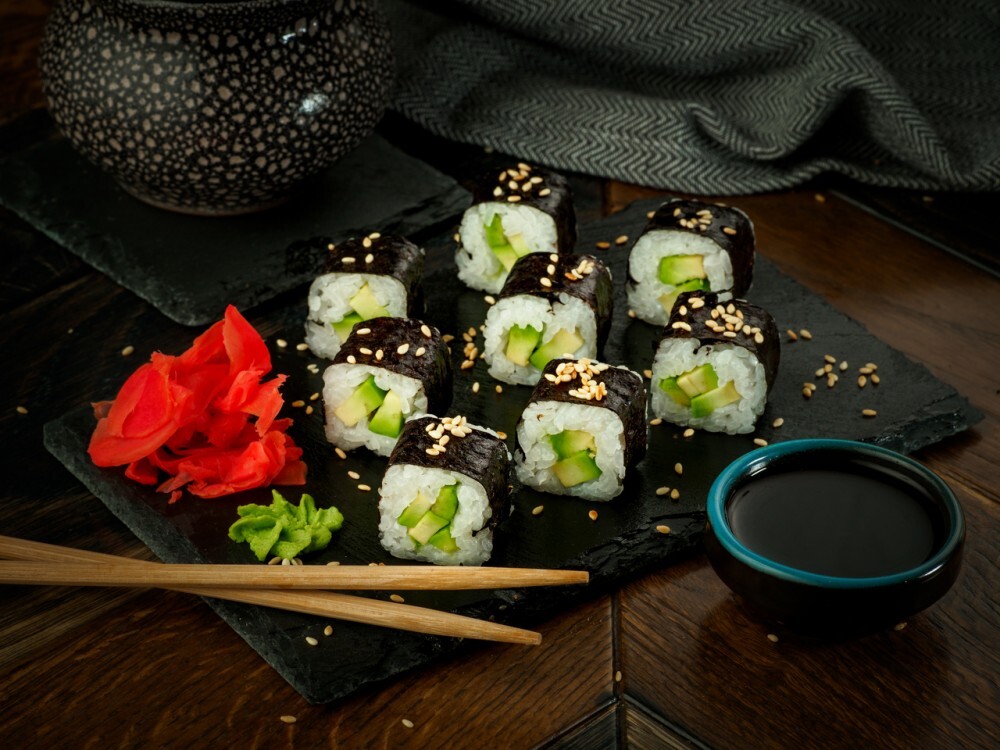 Авокадо, кунжут. Соевый соус, имбирь васаби 120/30/10/3 гр