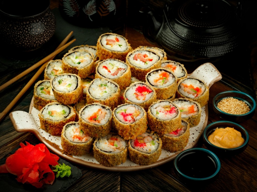 Горячие роллы кабуяки, фудзи, аори, сёндай, нидзя. Соевый соус, соус спайси, имбирь, васаби. 1155/100/100/30/15 гр