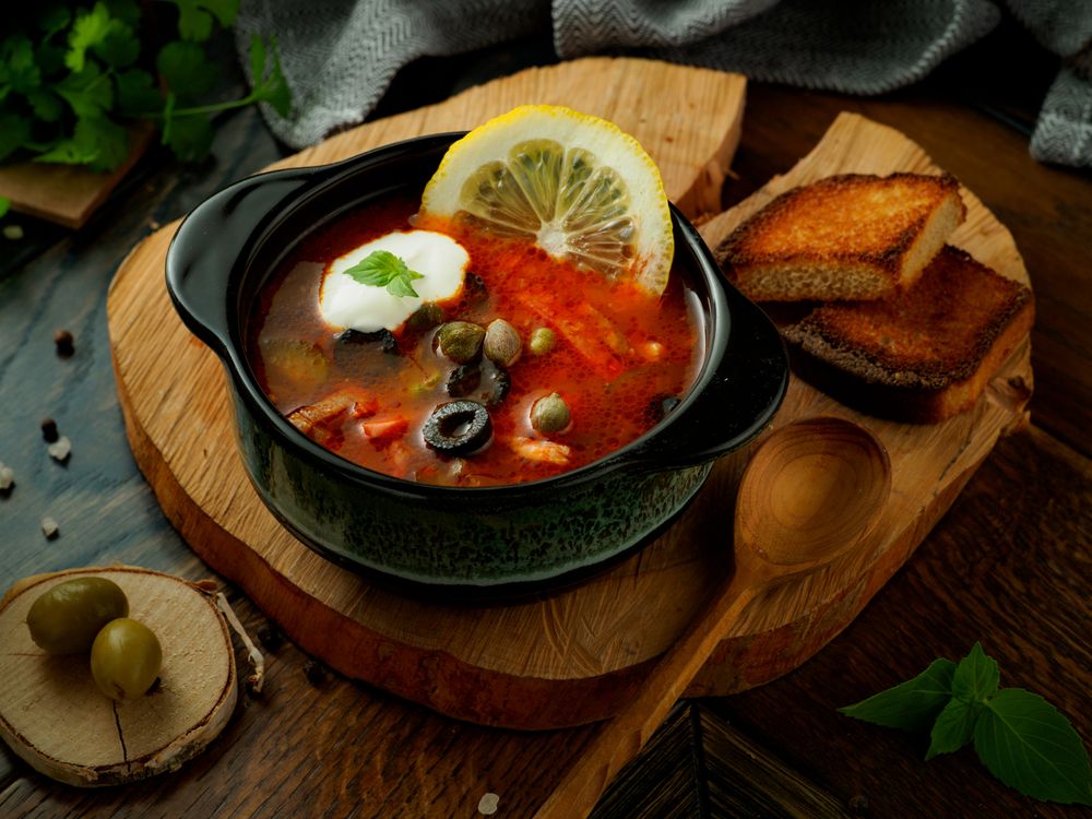 Традционная мясная солянка с набором мясных деликатесов, оливками, аджикой и специями, на мясном бульоне с бочковыми огурцами, подаём со сметаной и лимоном