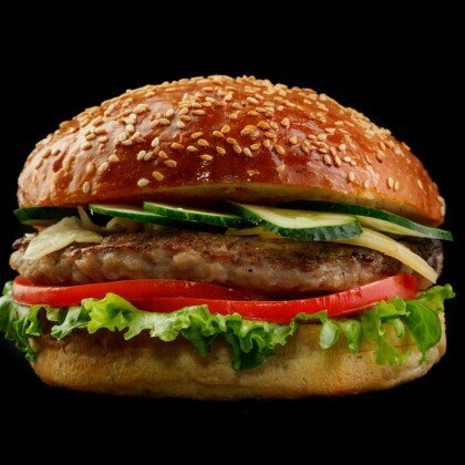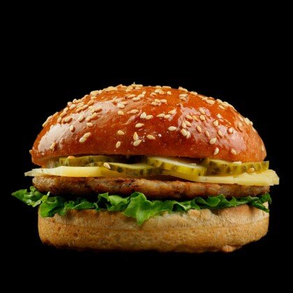 Состав: Булочка бриошь с кунжутом, майонез, кетчуп, маринованные огурчики, лук, свинина, сыр моцарелла, горчица, кетчуп