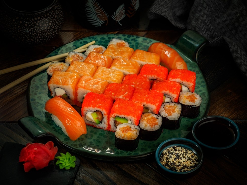Роллы Самурай, Сакура, Сяки маки, суши с лососем. Соевый соус, имбирь, васаби 730/90/30/9 гр