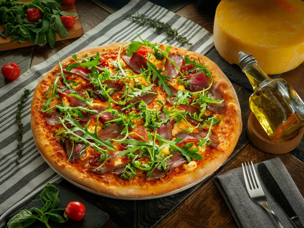 Соус, сыр моцарелла, домашний сыр, вяленые томаты, сыровяленая говядина, соус песто, руккола.
