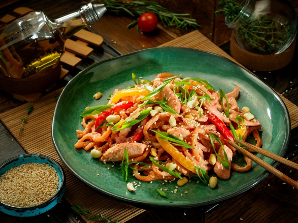 Лапша Удон, филе куриной грудки, перец болгарский, стручковая фасоль, лук зеленый, оригинальные соусы, арахис, кунжут жареный.