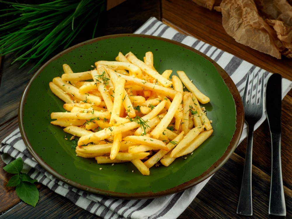 Картофель фри с чесноком, кунжутом и укропом