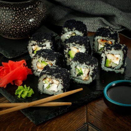 Жареный морской окунь, сыр сливочный, омлет, огурец. Соевый соус, имбирь, васаби. 255/30/10/3