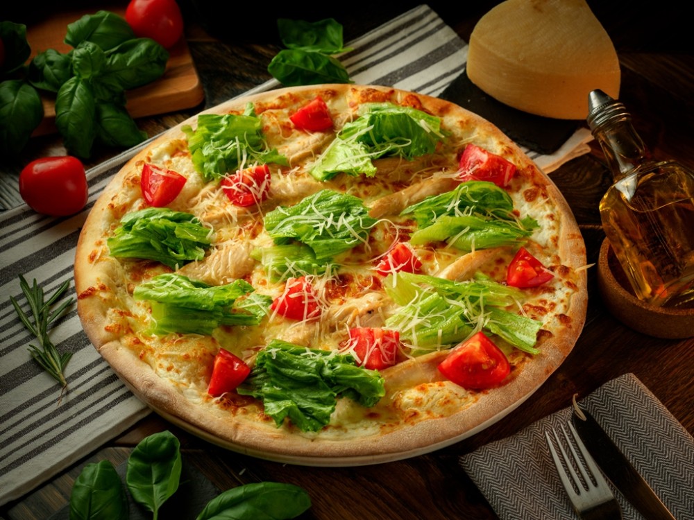 Соус сырный, сыр моцарелла, цыпленок BBQ, салат Айсберг, помидоры Черри, соус цезарь, сыр пармезан.