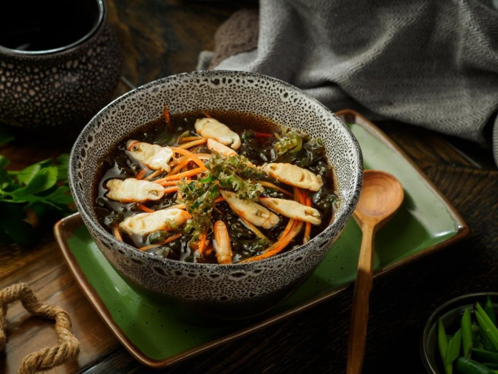 Бульон суимоно, тигровые креветки, морковь, водоросли вакаме, побеги бамбука, лук зеленый, рис.