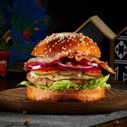 Состав: Булочка бриошь с кунжутом, говядина, сырный соус, салат Айсберг, сыр моцарелла, чеснок, соус сливочный, , вяленые томаты, маринованные огурчики, красный лук, маслины.