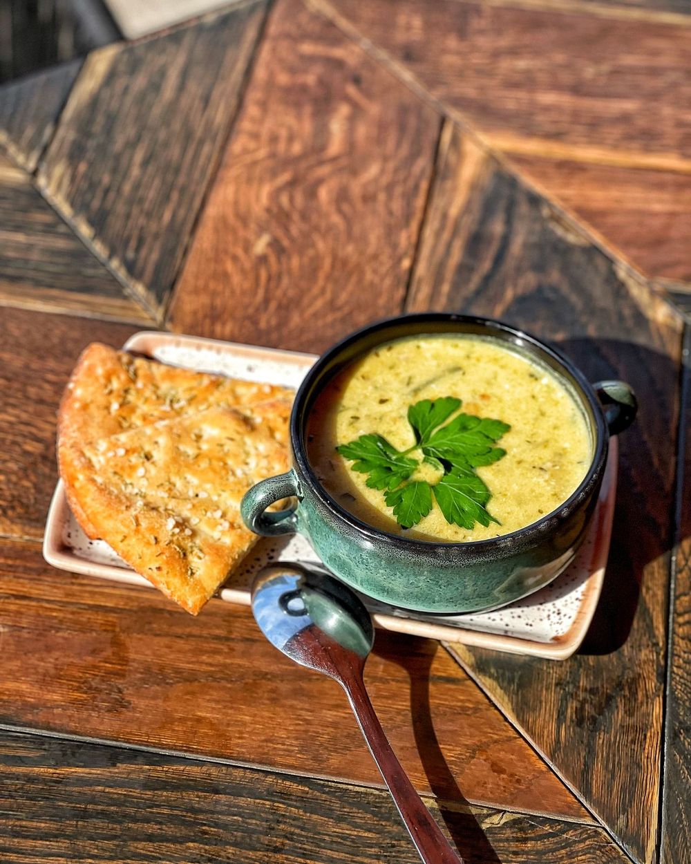 Наваристый суп со свининой, овощами, сливками, специями. Подается с фокачей.