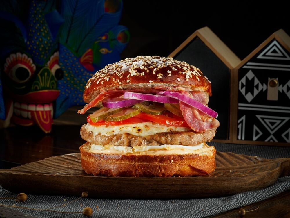 Состав: Булочка бриошь с кунжутом, сыр моцарелла, сырный соус, яйцо, горчица, свинина, помидоры, маринованные огурчики, лук, жаренный бекон, соус Шри-ланка