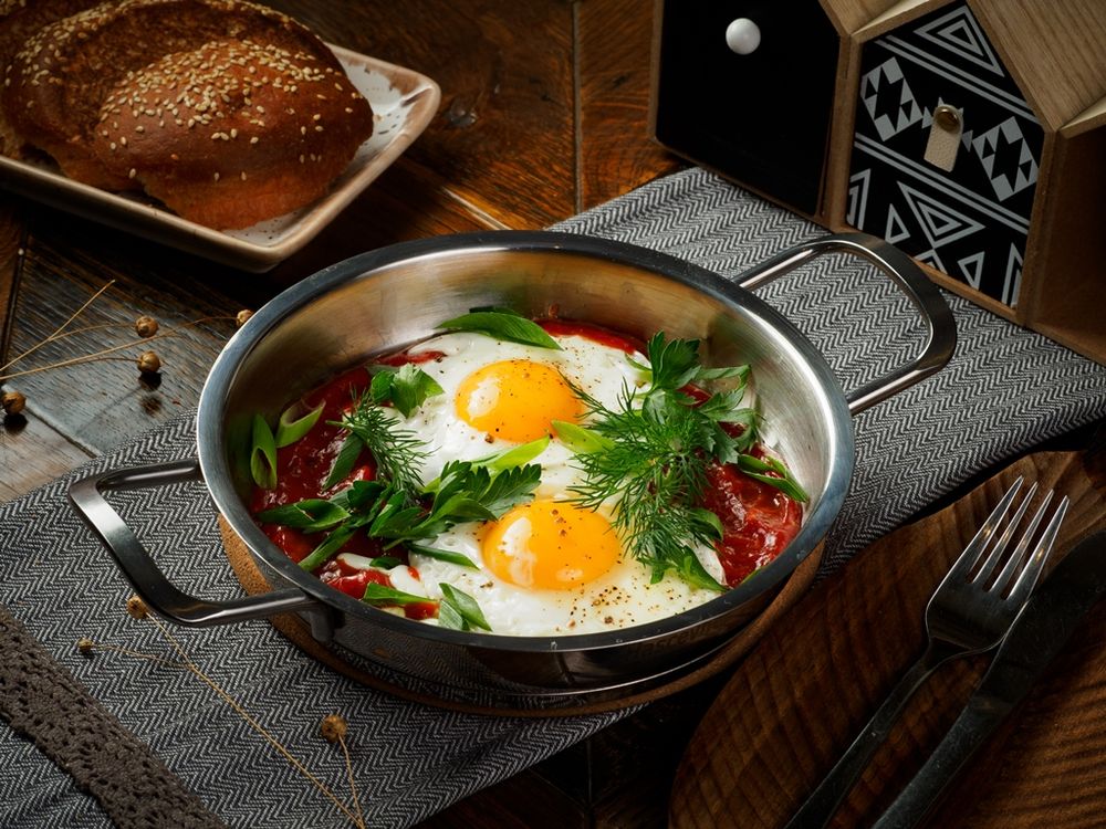 Кофе/чай/какао + шакшука из 2х яиц, зелень, тосты