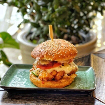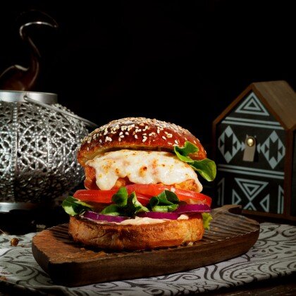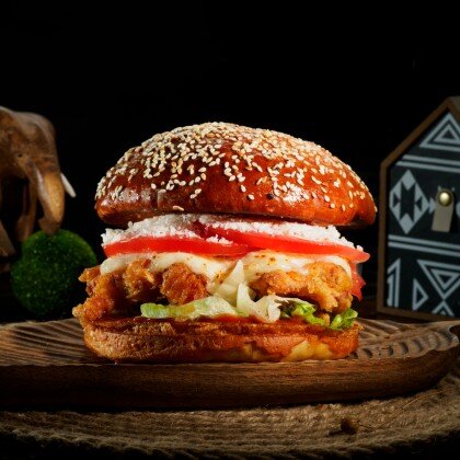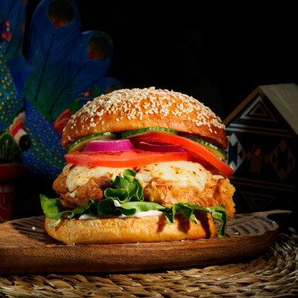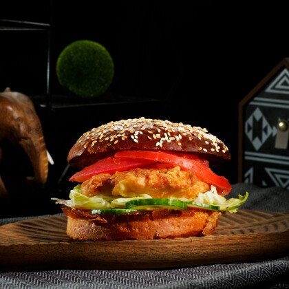 Состав: Булочка бриошь с кунжутом, куриная грудка, маринованные огурчики, соус сырный, салат Айсберг, сыр Чеддер, помидоры, соус айоли