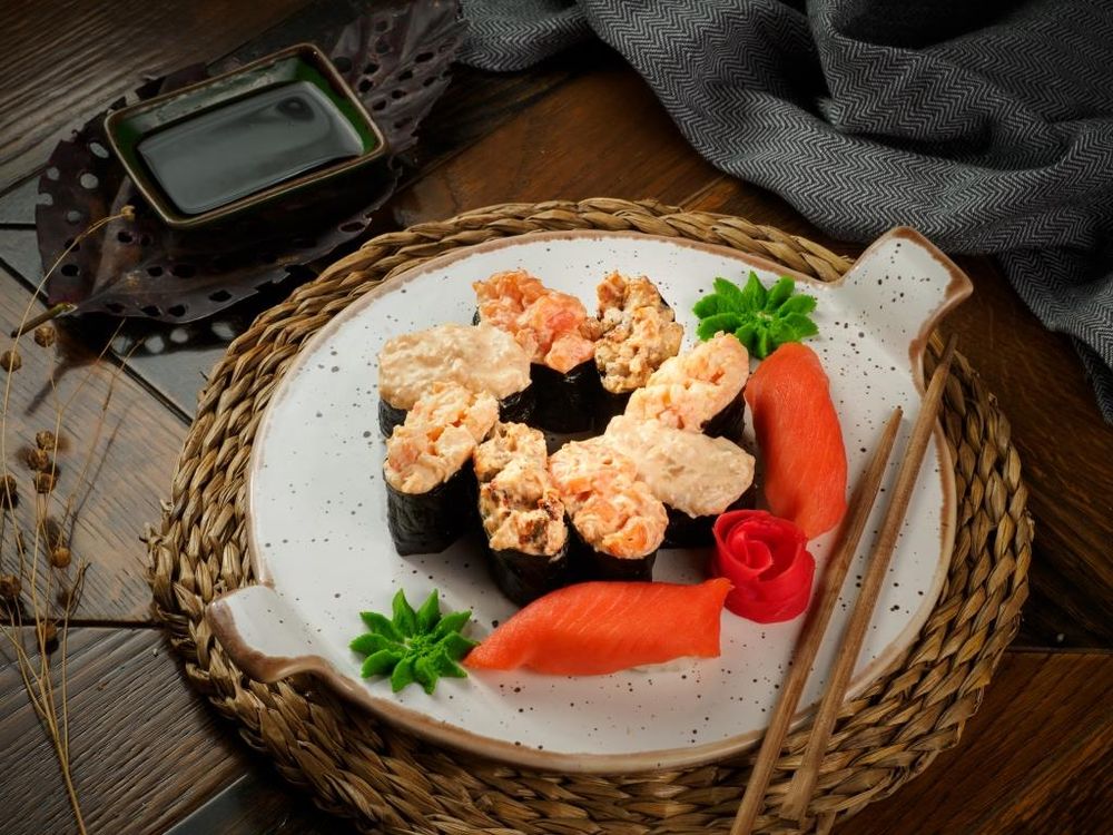 Спайси с креветкой 2 шт, спайси со свежим лососем 2 шт, спайси с угрём 2 шт, спайси с морским гребешком 2 шт, суши с копченым лососем 2 шт. Соевый соус, Имбирь, васаби. 400/50/20/6 гр