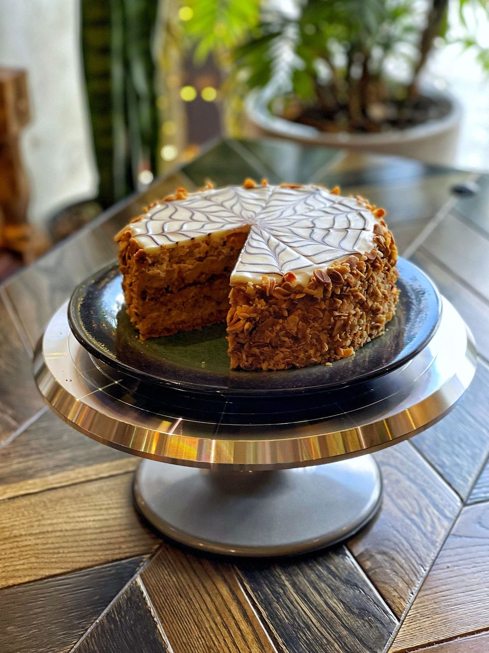 Выпекаем сами. Миндальные меренговые коржи. Заварной крем со сгущенным молоком, миндалем, сливочным маслом и ромом Бакарди, шоколад, лепестки арахиса. В наличии и под заказ.