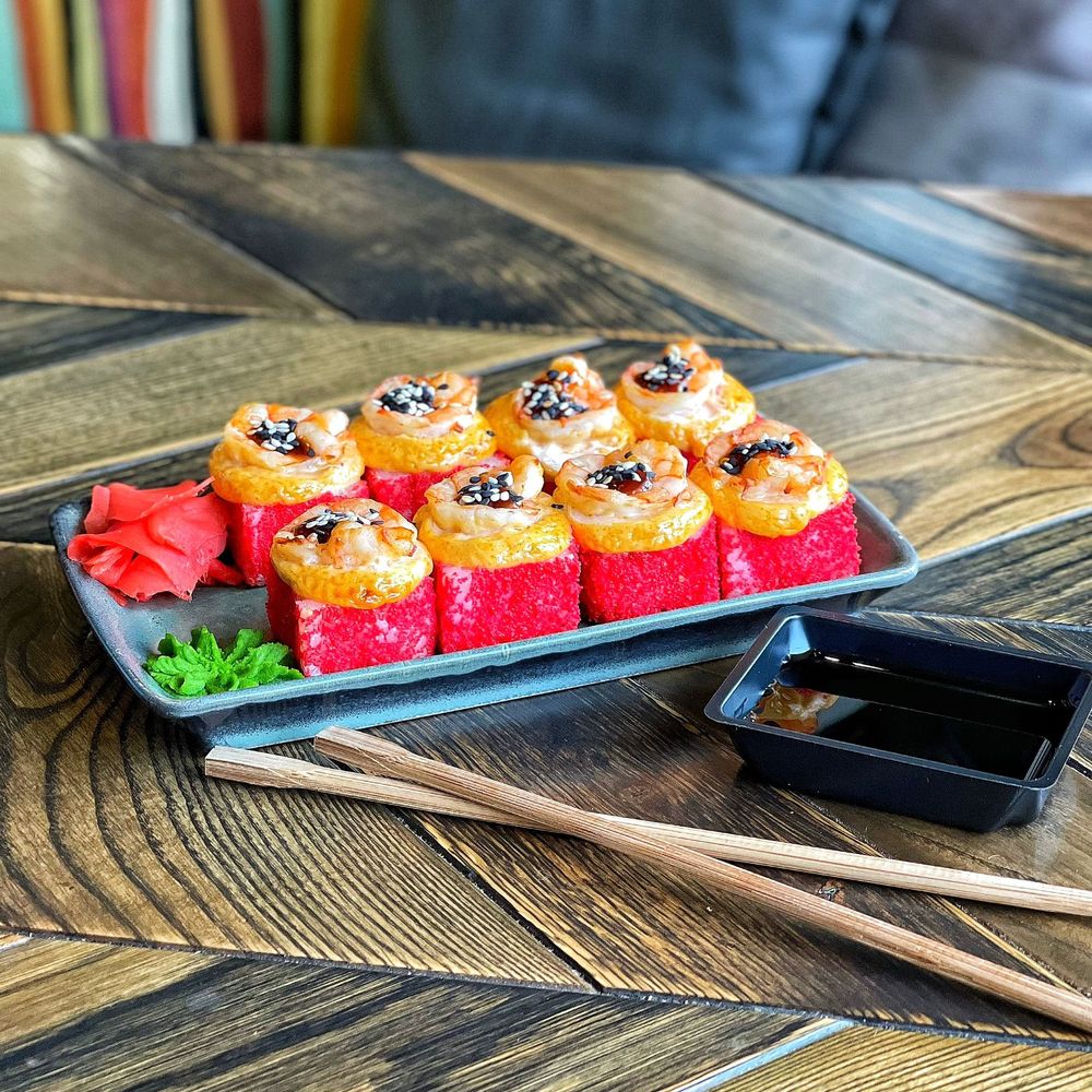 Креветка тигровая, сыр сливочный, свежий огурец, икра масаго малиновая, соус спайси, соус унаги. Соевый соус, имбирь, васаби.