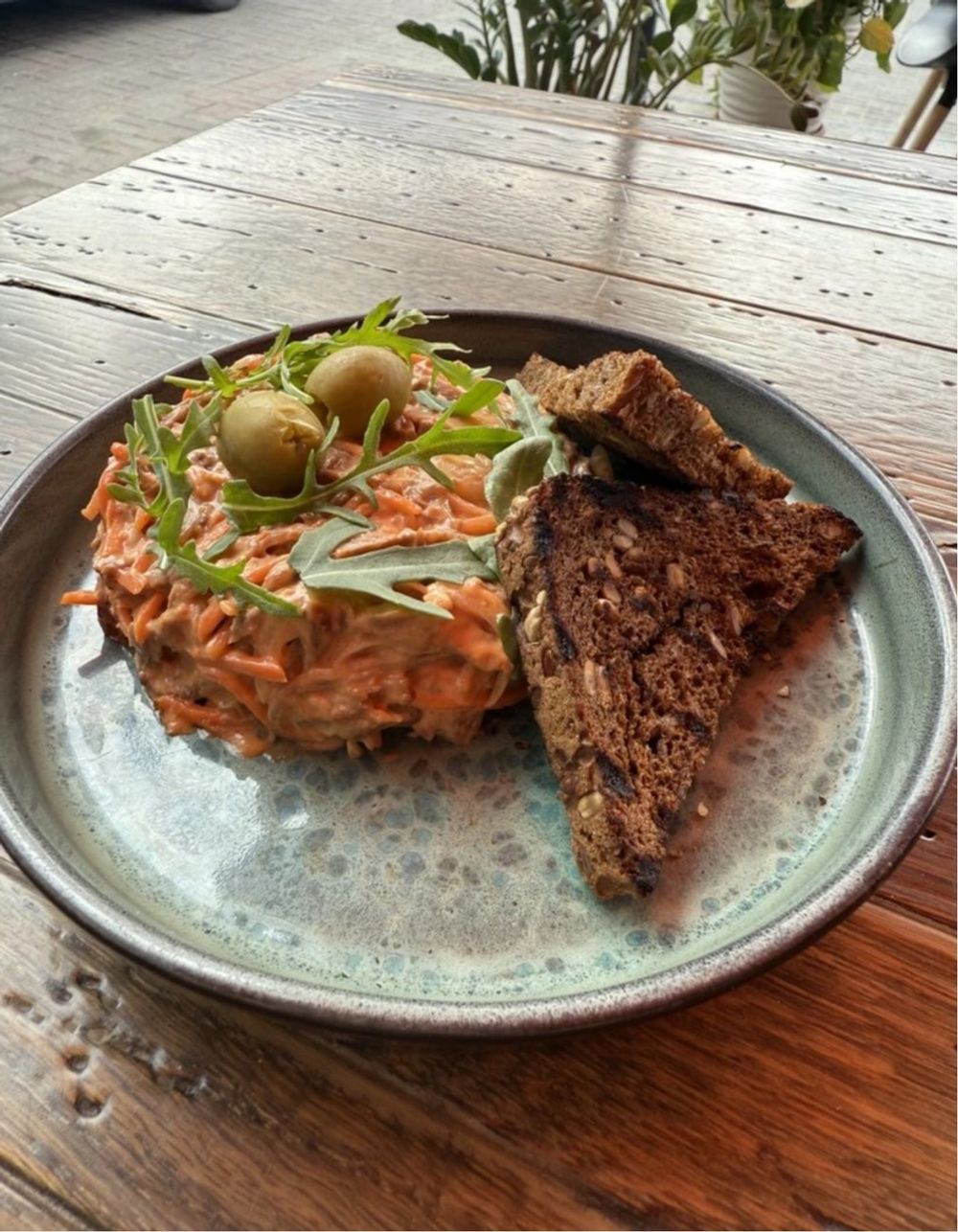 Говядина отварная, морковь по-корейски, маринованнный лук, майонез, кетчуп, руккола, зерновой хлеб.
