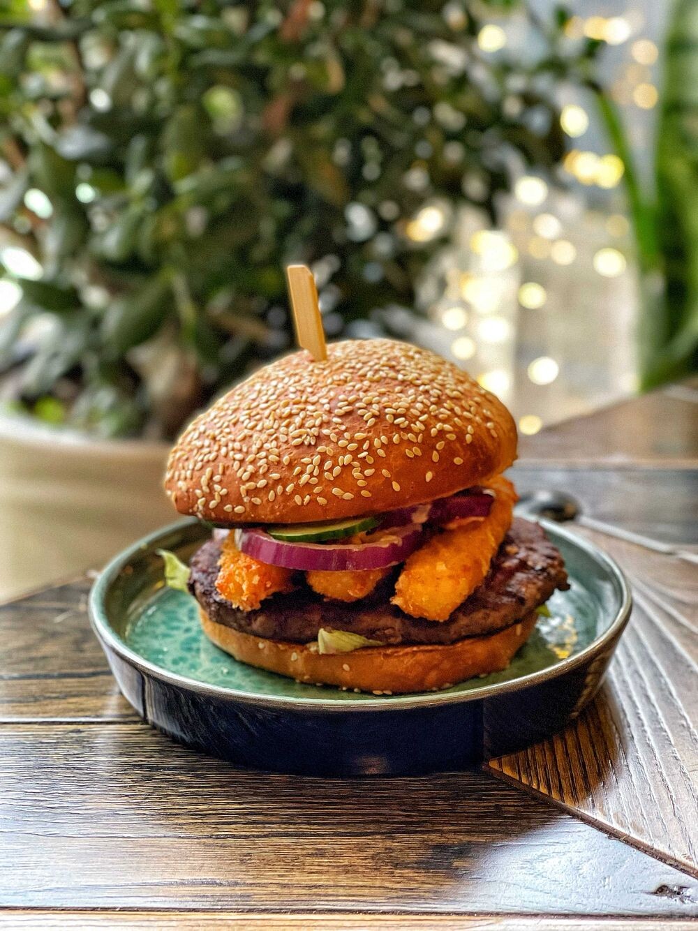 Состав: Булочка бриошь с кунжутом, сырный соус, свинина, сыр фри, салат Айсберг, огурчики свежие, лук красный маринованный, кетчуп, соус брусничный.