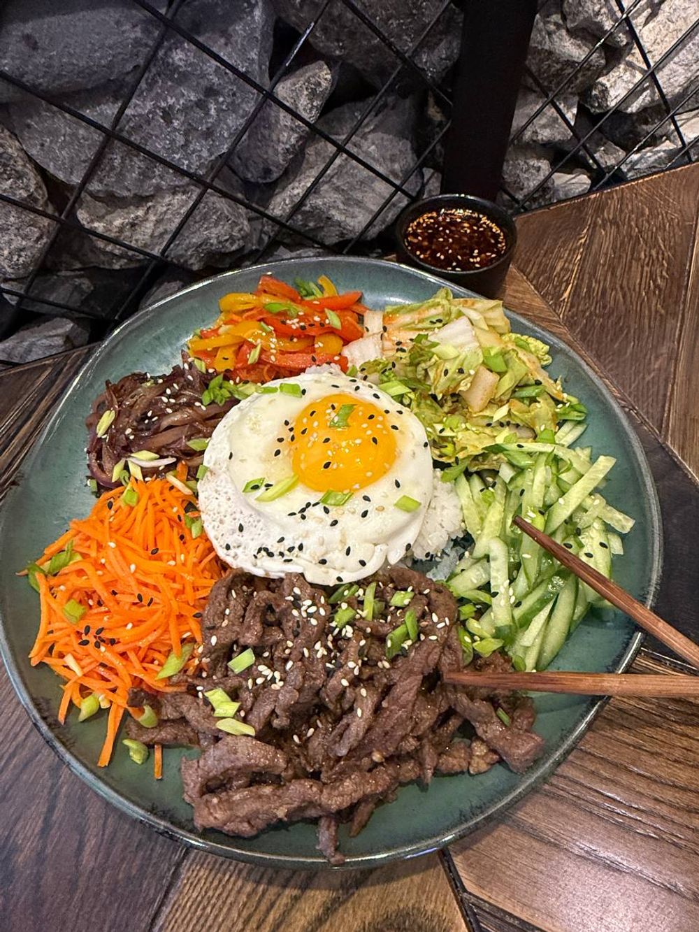 Отварной рис, яйцо жареное, красный лук, морковь, огурцы свежие, перец болгарский, капуста кимчи, говядина, зеленый лук, кунжут, специальный острый соус.