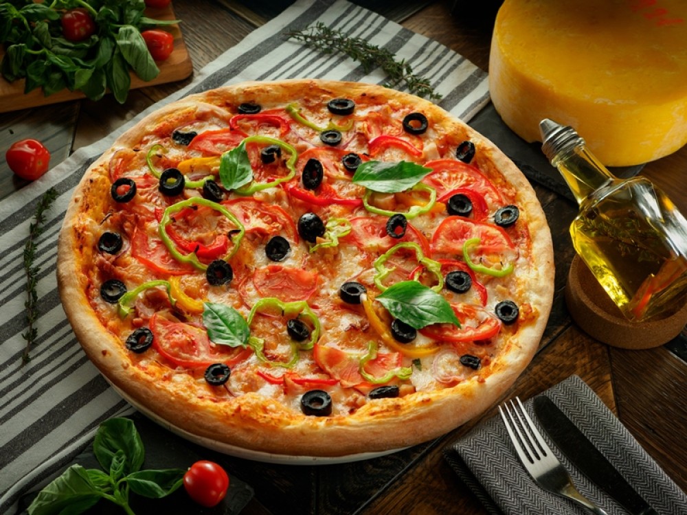 Состав: соус, сыр моцарелла, лук, курица копченая, помидоры, болгарский перец, маслины, базилик