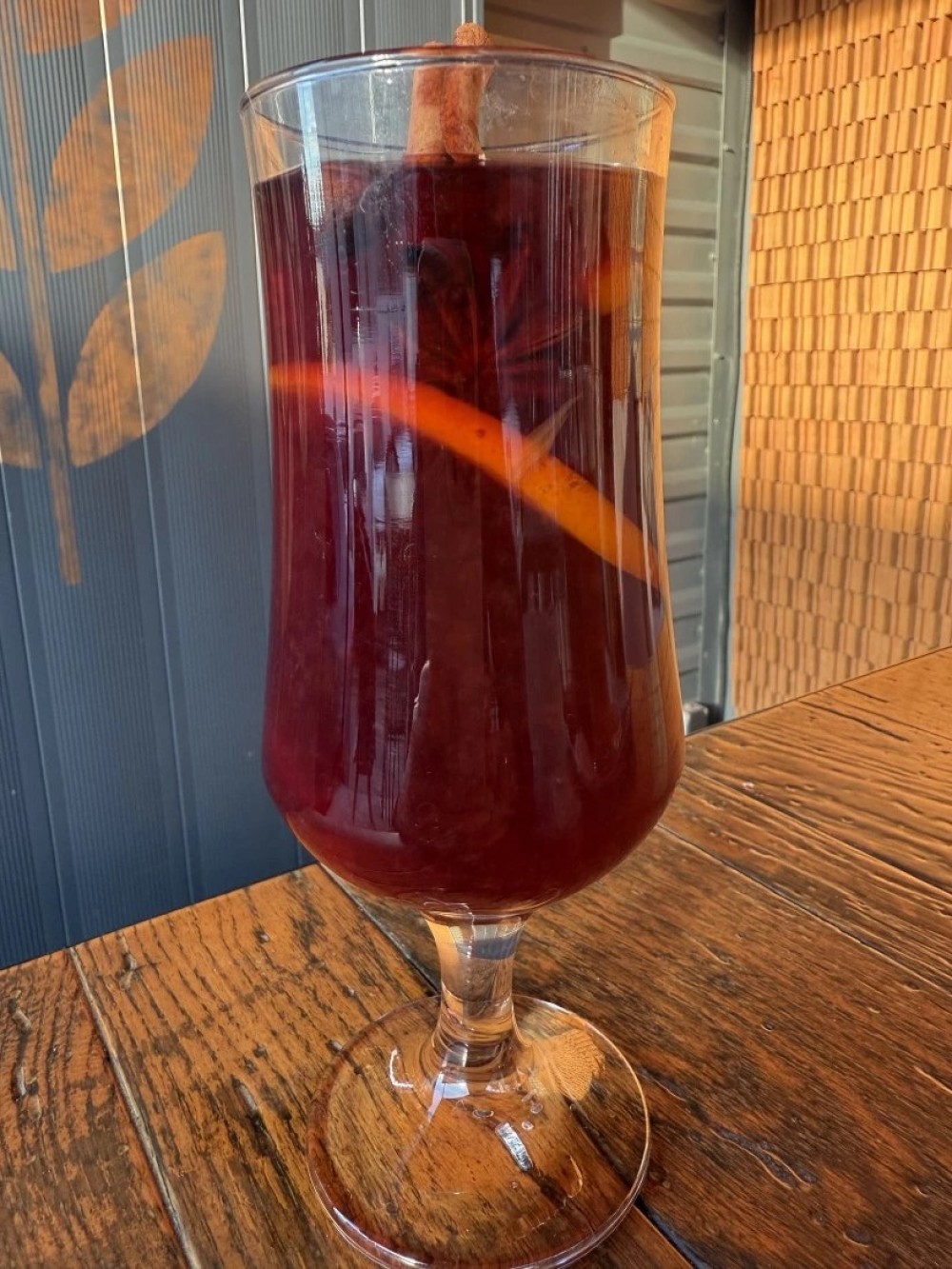 Сок вишневый, сироп глинтвейн, вишневое пюре, лимонный сок, специи, апельсин, лимон