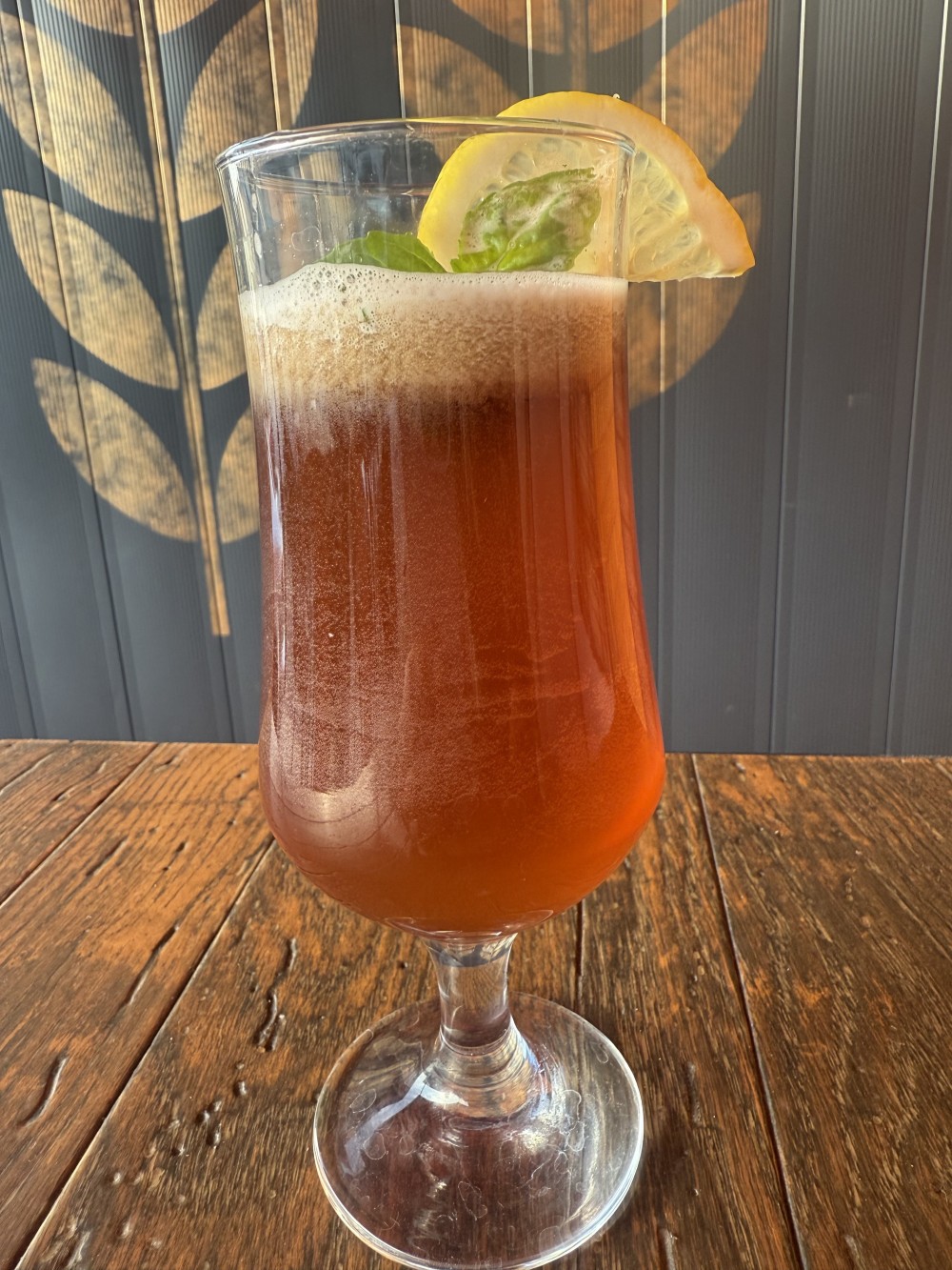 Чай черный, пюре малиновое, сироп базилик, лимон, листочки базилика