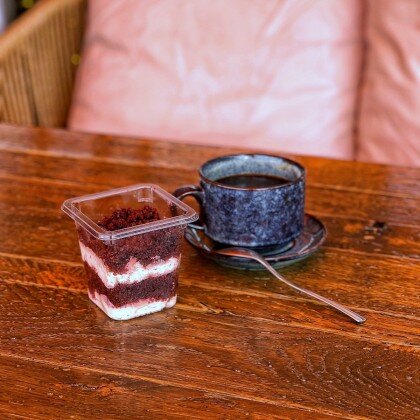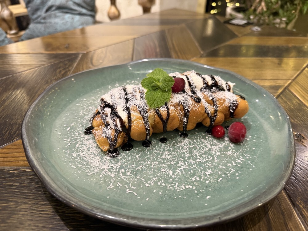 Гонконгская вафля по собственному рецепту, крем творожный со сливками, топпинг шоколад, кокосовая стружка.
