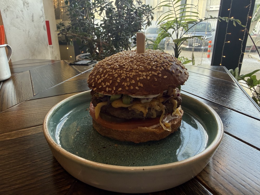 Булочка бриошь с кунжутом, котлета из свинины, манго свежий, авокадо, лук красный, сыр Чеддер, перчик халапеньо, помидор, горчица зерновая, фирменный соус.