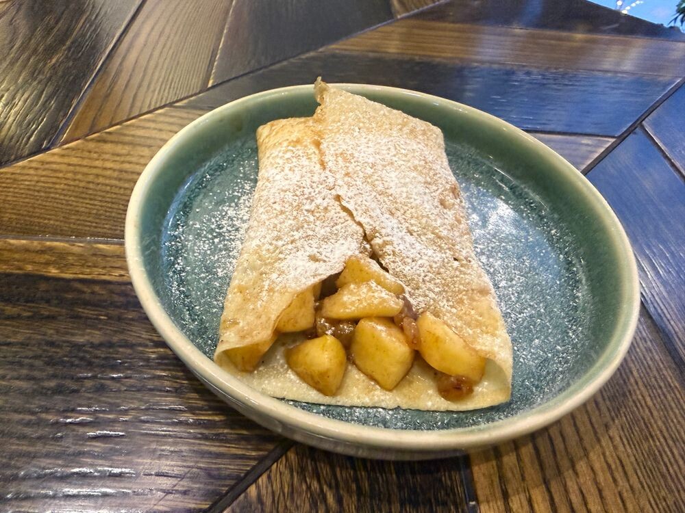 Блинчики, карамелизованные яблоки, корица, грецкий орех - декор.