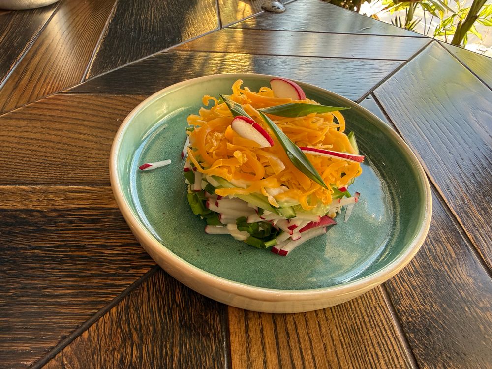 Редиска, свежий огурец, лук зеленый, яйцо, сыр Чеддер, майонез.