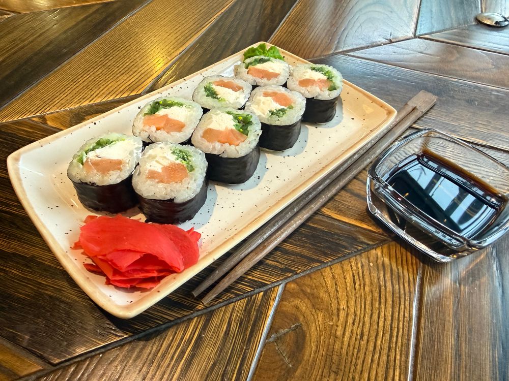 Лосось х/к, сыр сливочный, салат "Чукка". Нори. Соевый соус, имбирь, васаби 220/30/10/3 гр